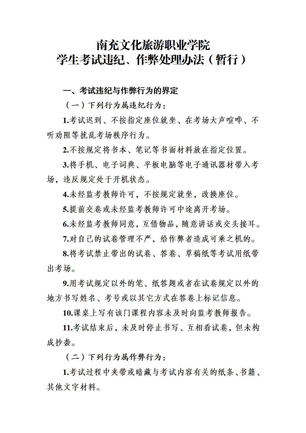 南充文化旅游职业学院学生考试违纪、作弊处理办法(暂行)的通知