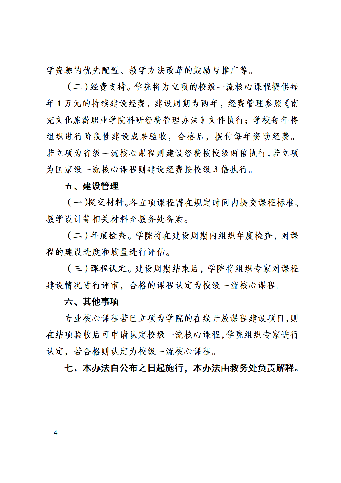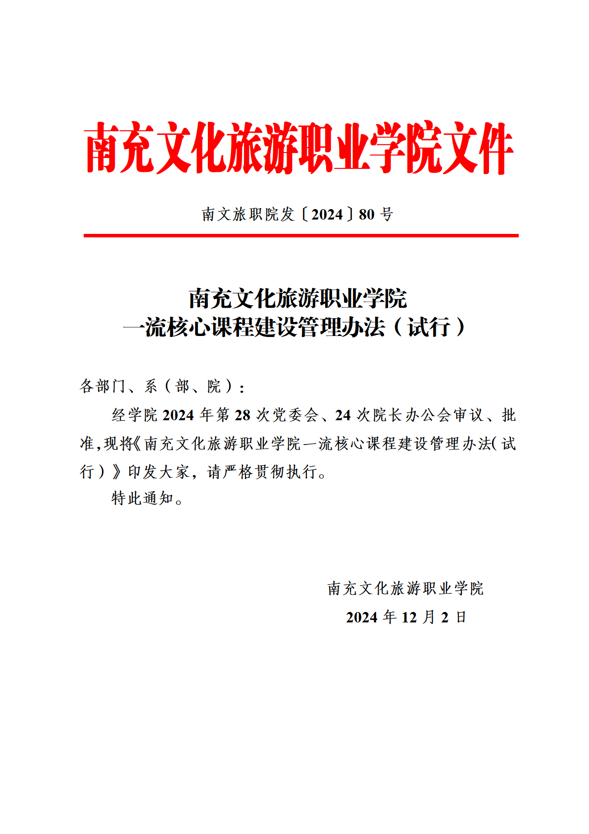 南充文化旅游职业学院一流核心课程建设管理办法(试行)的通知