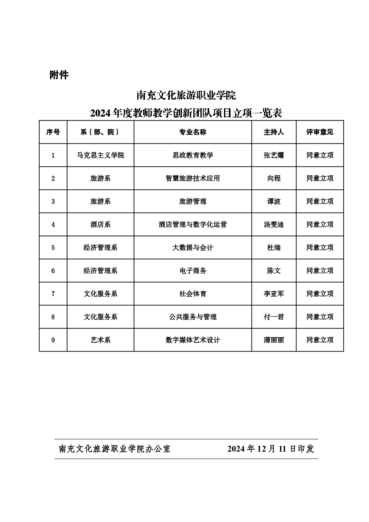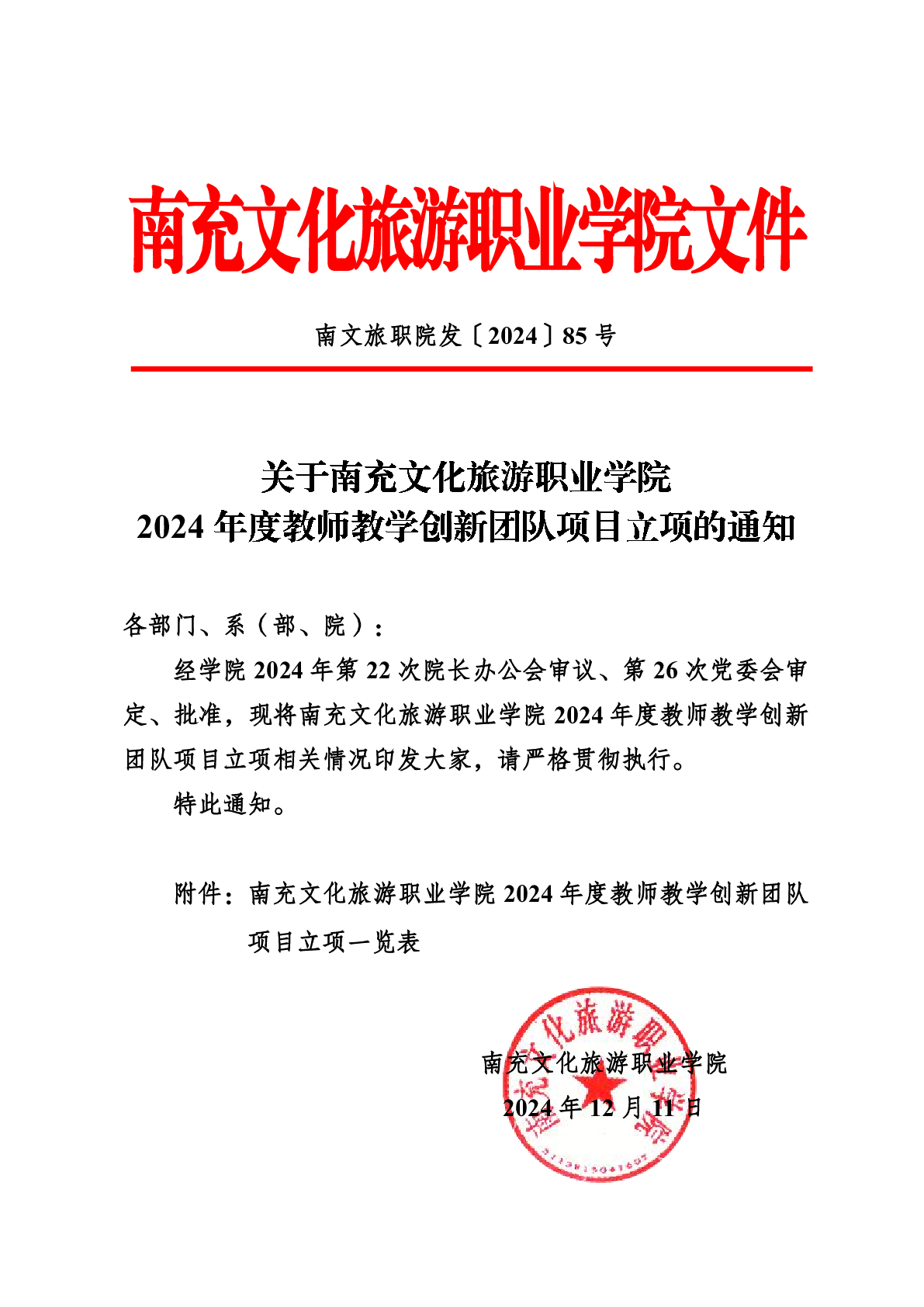 关于南充文化旅游职业学院2024年度教师教学创新团队立项通知