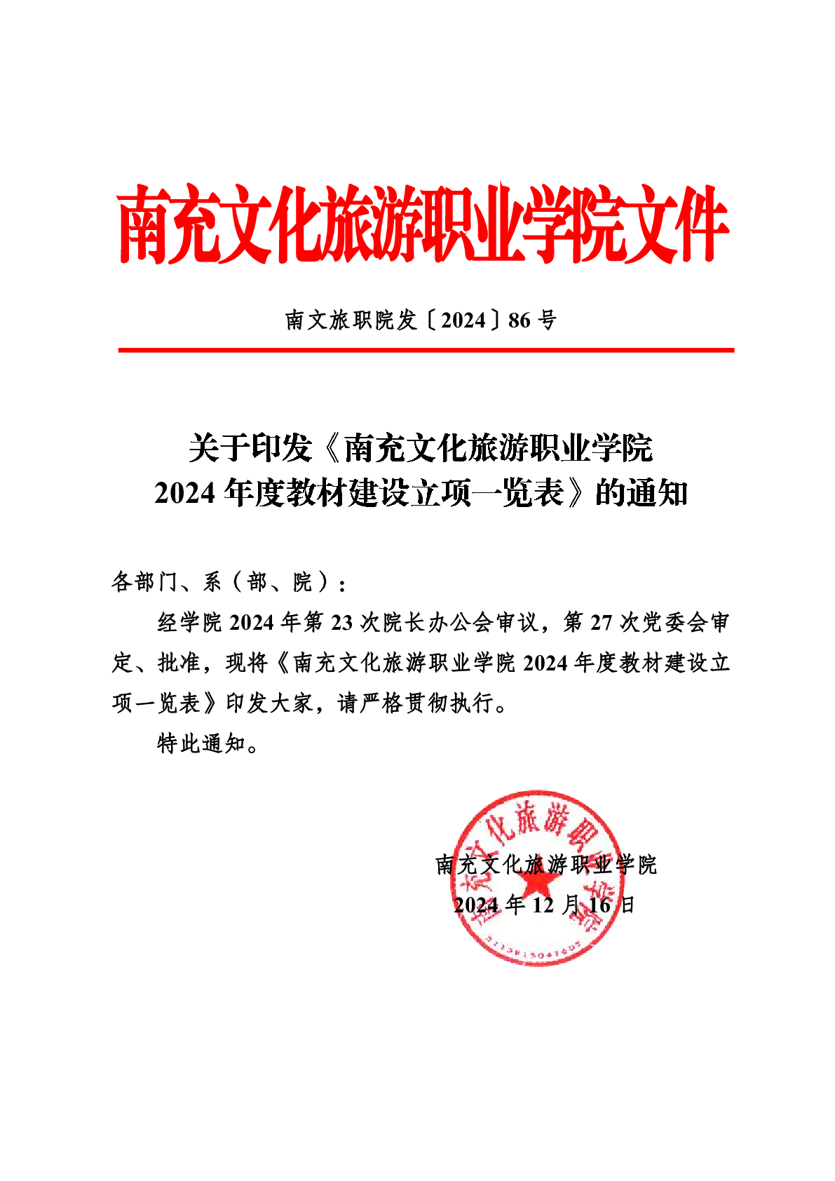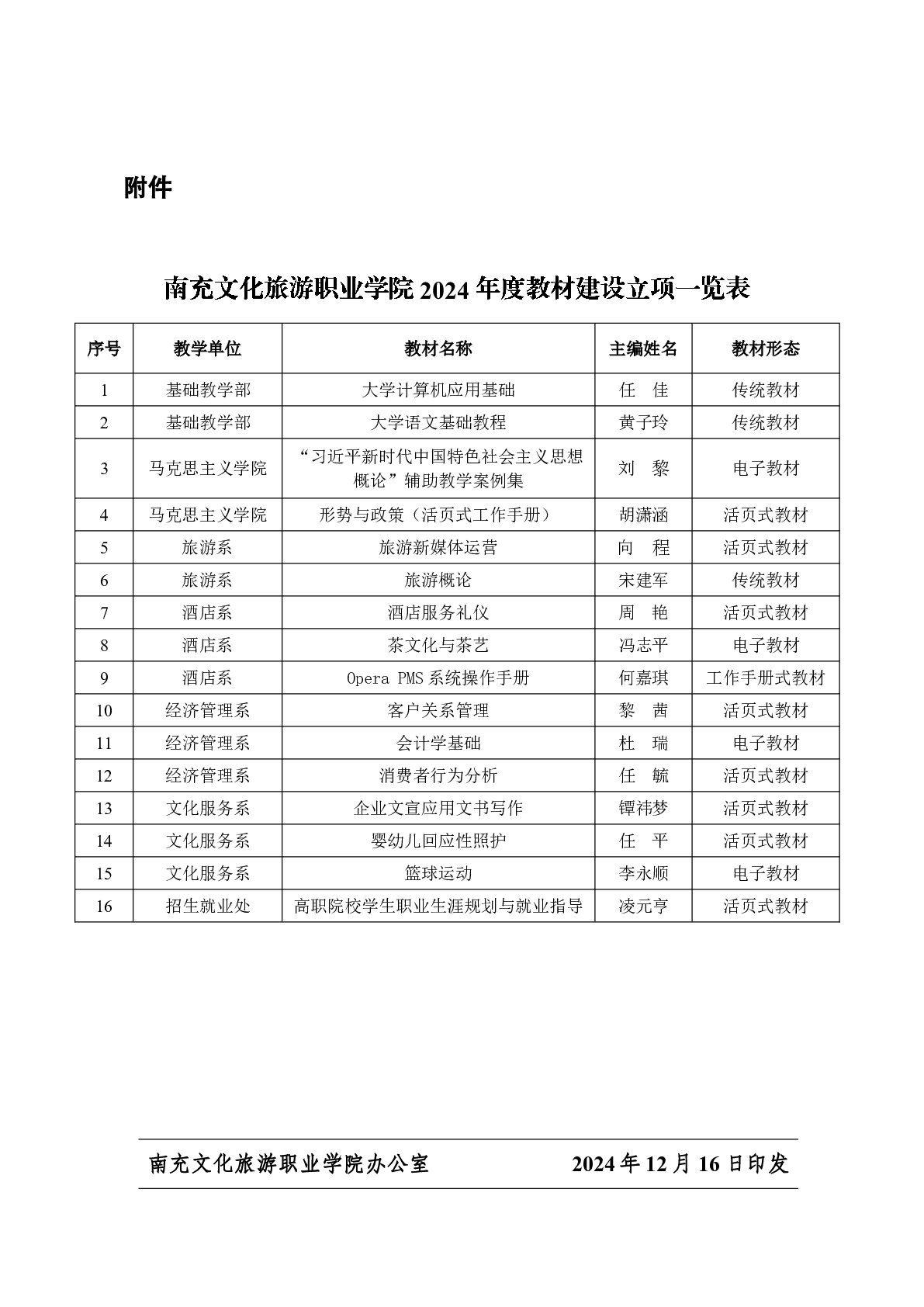 关于印发《南充文化旅游职业学院2024年度教材建设立项一览表》的通知